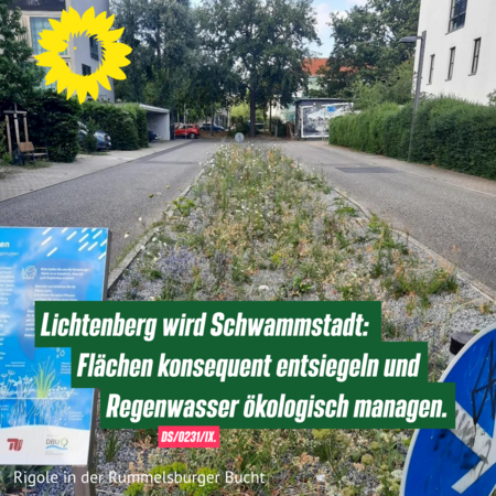 Das übergeordnete Ziel dieses Entsiegelungskonzepts und des Regenwassermanagements ist die Entwicklung unseres Bezirks zur „Schwammstadt“ durch den Ausbau von Regenwasser-Versickerungsflächen und Maßnahmen zum Speichern und Nutzen von Regenwasser vor Ort. Die anschließende Begrünung der entsiegelten Flächen soll nicht nur den Erhalt und die Ausweitung des Straßengrüns bewirken, sondern vor allem die Bindung von CO2 und Wasser sicherstellen, Abkühlung ermöglichen und unsere Klimaresilienz verstärken.