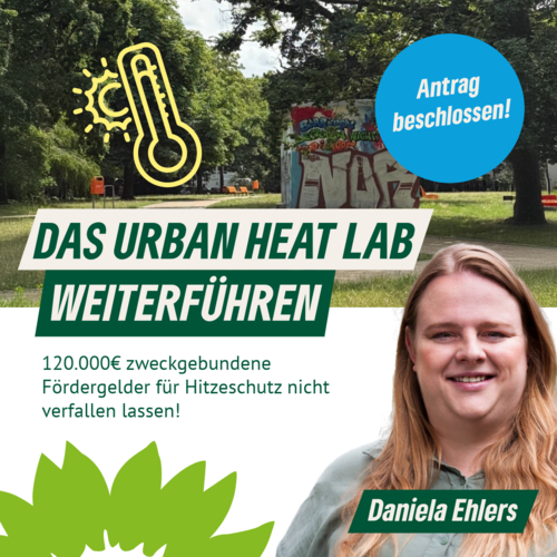 Die Fraktion BÜNDNIS 90/DIE GRÜNEN legt in der letzten Bezirksverordnetenversammlung (BVV) vor der Sommerpause den Fokus auf Hitze- und Klimaschutz: Per Dringlichkeitsantrag sollen 120.000€ Fördergeld für das "Urban Heat Lab" gerettet werden.