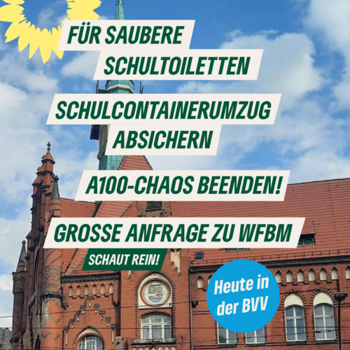 Die Fraktion BÜNDNIS 90/DIE GRÜNEN ist sehr zufrieden mit den Ergebnissen der gestrigen BVV in Lichtenberg: Der Antrag für zuverlässige Busse trotz A100-Chaos wurde beschlossen, ebenso ein Antrag, der die Finanzierung einer Zwischenreinigung für Schultoiletten fordert. Außerdem wird der Bezirk die Initiative „alkoholfreie Kasse“ unterstützen und sich um mehr Perspektiven in der Stadtentwicklung bemühen.